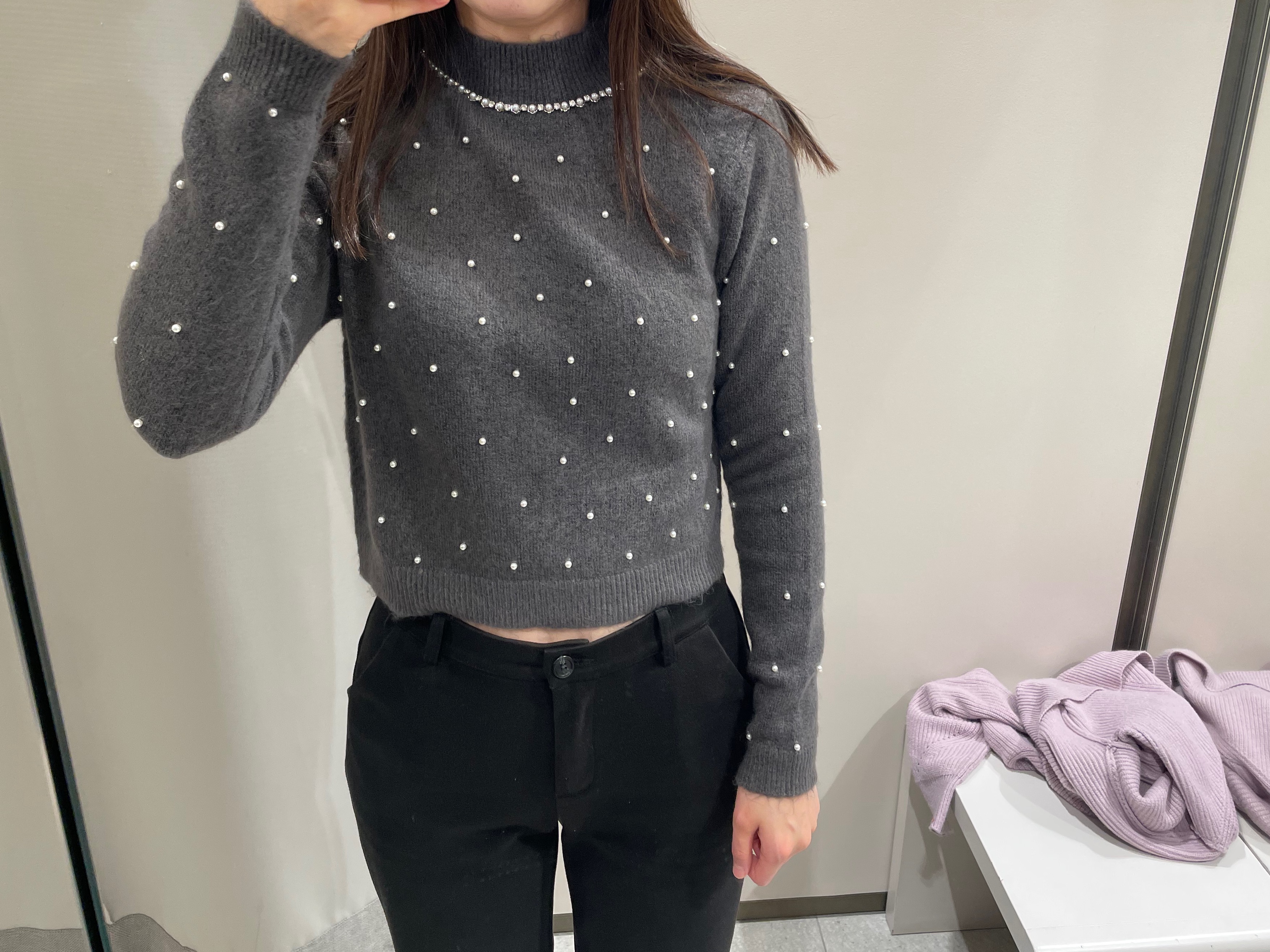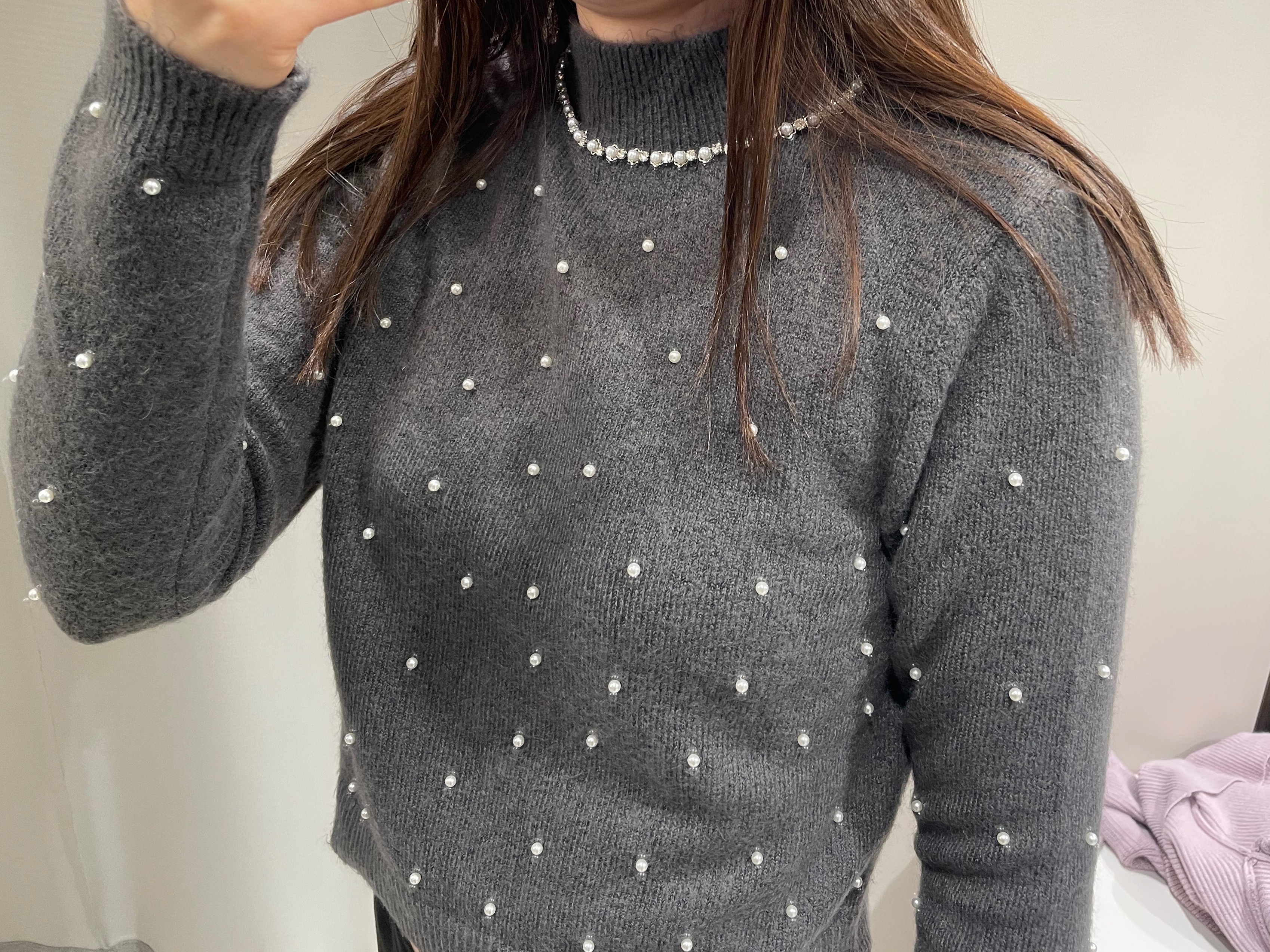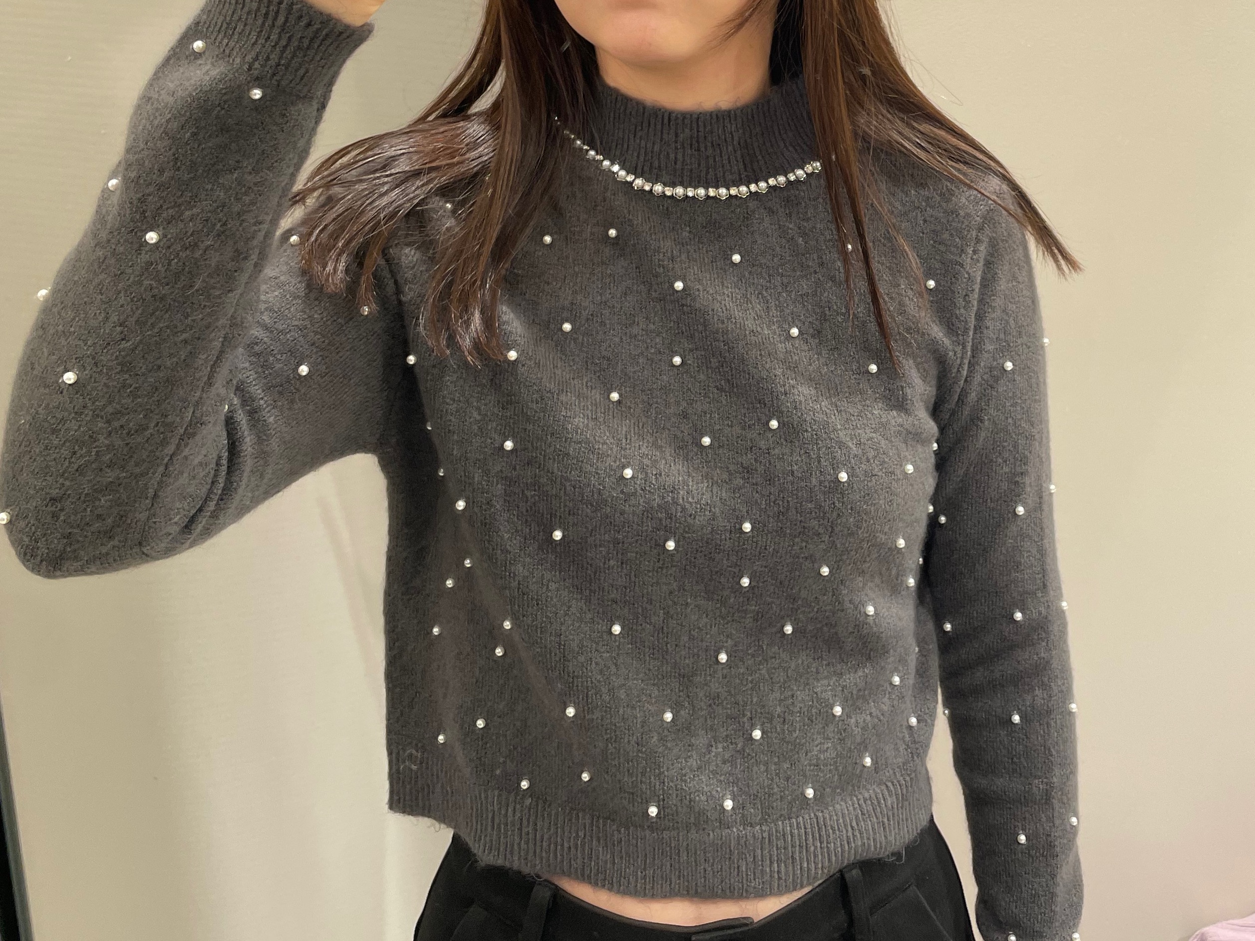 다음 제품은 요 니트 제품인데요. 크롭 기장의 니트이고, 중간중간 진주 느낌의 구슬이 박혀있어요. 목 부분에 목걸이처럼 큐빅이 둘러있는 것도 하나의 포인트!